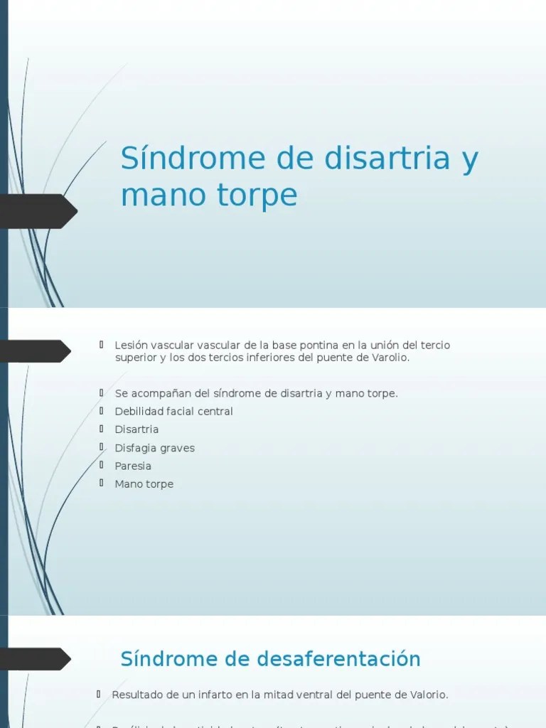 Es un síndrome que combina hemiparesia con síntomas.. . Disartria y mano torpe disartria y mano torpe es el síndrome lacunar extrahospitalario más frecuente.